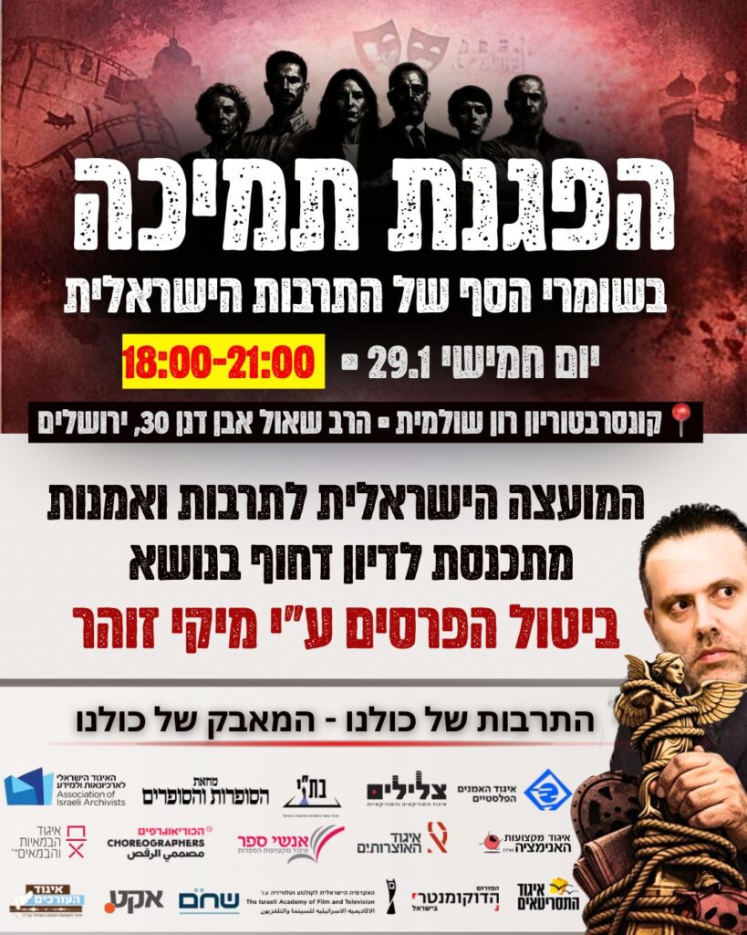 ביום חמישי הקרוב, ה-29.1, החל משעה 18:00, יקיימו איגודי היוצרים והיוצרות בישראל הפגנת תמיכה בחברי המועצה הישראלית לתרבות ואמנות, שתתכנס באותה שעה לדיון דחוף בנושא ביטול פרסי עידוד היצירה על ידי שר התרבות, מיקי זהר.