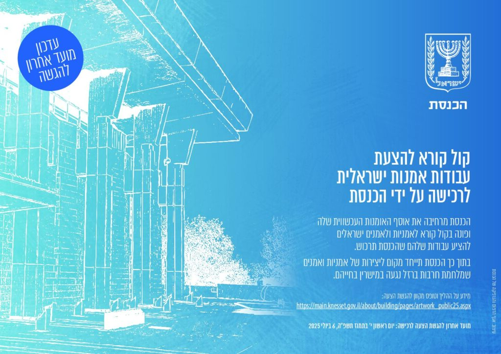 הכנסת פרסמה לאחרונה קול קורא לאמניות ולאמנים ישראלים להצי לרכוש מיצירותיהם לשם הצגתן ברחבי משכן הכנסת או במוזיאון הכנסת. היצירות שייבחרו יהוו שכבה נוספת באוסף האמנות של הכנסת. הכנסת תייחד מקום ליצירות אמניות ואמנים שמלחמת חרבות ברזל נגעה בחייהם באופן ישיר יותר: יוצרים ויוצרות שהשתתפו במלחמה, אמניות ואמנים שבן או בת משפחתם גויסו לשירות והם נשארו לתפקד כחלק מהחזית האזרחית, או מי שפונו או התפנו מבתיהם בדרום ובצפון בשל המלחמה.