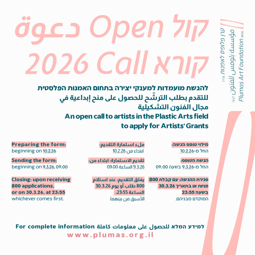קרן פלומס לאמנות (ע״ר) מזמינה אמנים ואמניות בתחום האמנות הפלסטית להגיש מועמדות למענקי יצירה.